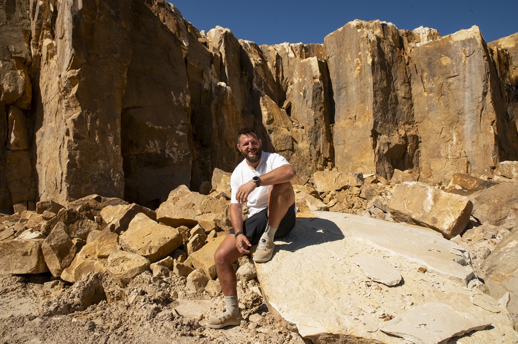 Lukáš se přijel do lomu podívat osobně. Procházel bloky kamene, zjišťoval jejich původ a zajímalo ho vše – od geologické vrstvy až po způsob těžby. Po výběru následovalo čtyřicet dní ručního opracování.